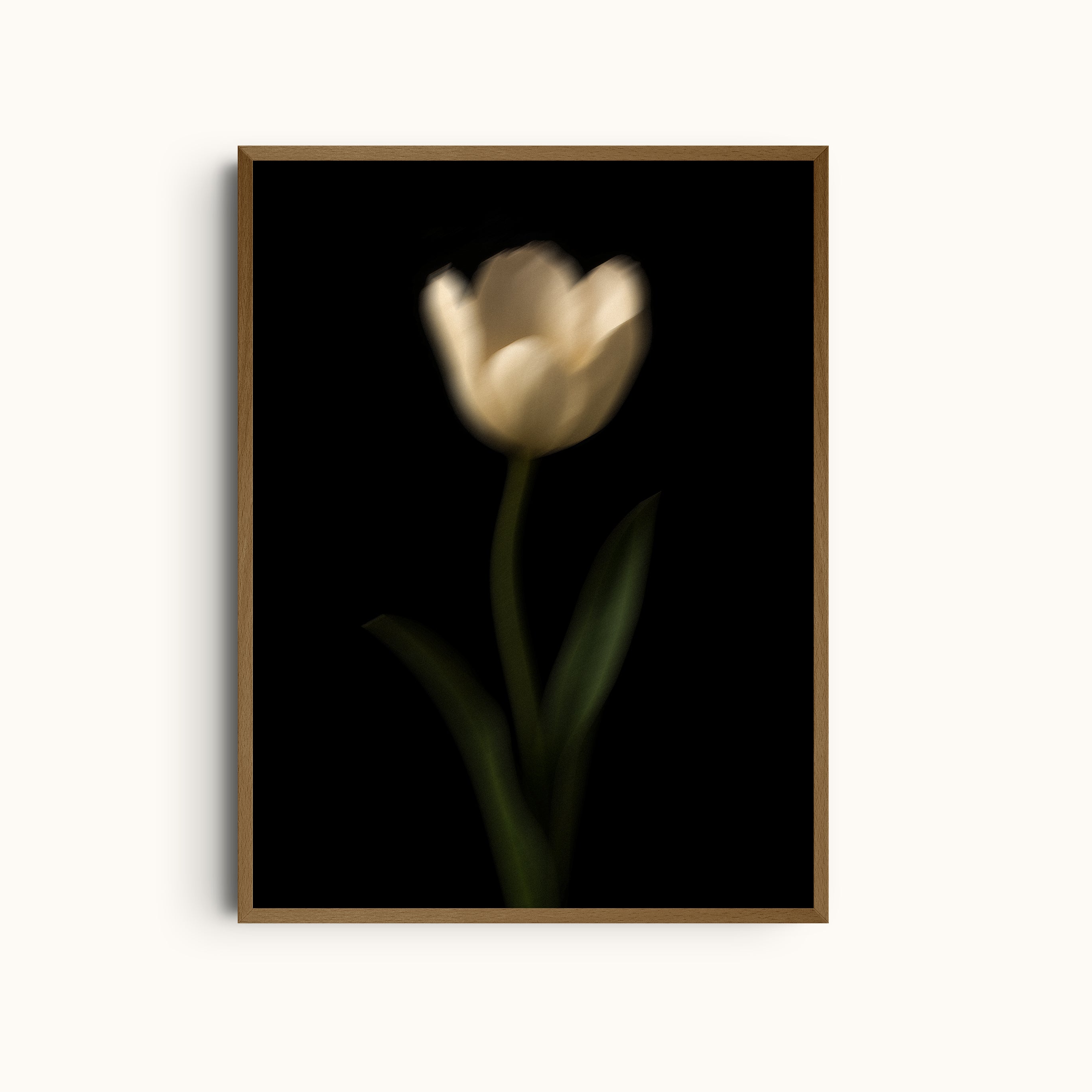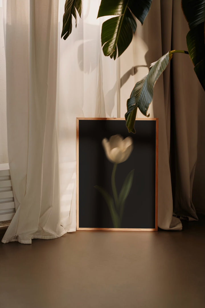 Charcoal Tulip is a minimalist floral art print featuring a single white tulip with a soft green stem set against a deep charcoal background. The contrast between the dark, moody backdrop and the delicate bloom creates a feeling of quiet strength and refined elegance. Perfect for modern, Japandi, or monochrome interiors, it brings both drama and serenity to a space. A timeless choice for those who appreciate understated beauty with a bold edge.