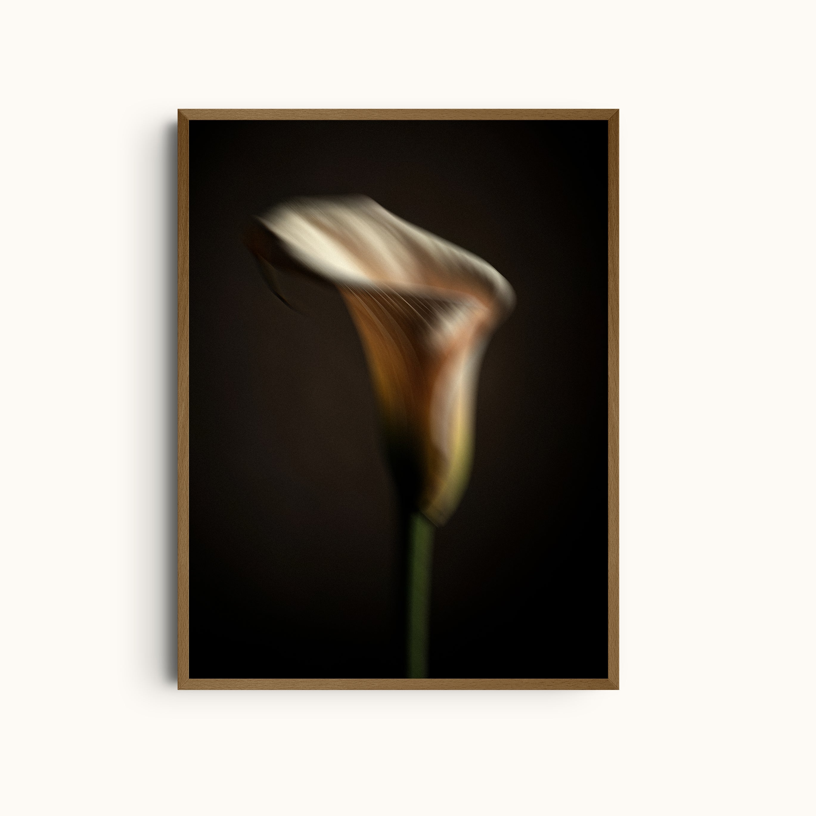 Muted Elegance is a minimalist floral wall art print featuring a softly blurred white calla lily set against a deep, moody background. The calla lily, known for its sculptural form and symbolism of purity, grace, and rebirth, brings an air of quiet sophistication to any space. The contrast between the luminous white petals and the dark backdrop creates depth and drama, making it ideal for Japandi bedrooms, Scandinavian living rooms, or warm minimalism apartments. A refined statement piece for interiors that embrace simplicity, balance, and timeless beauty.