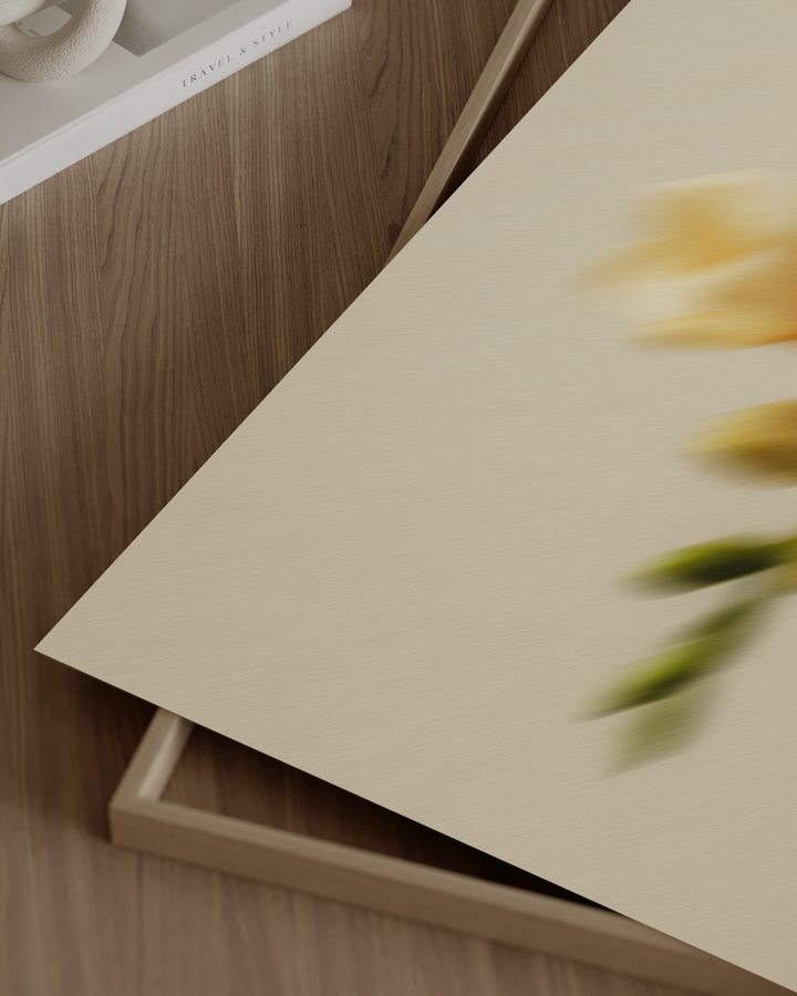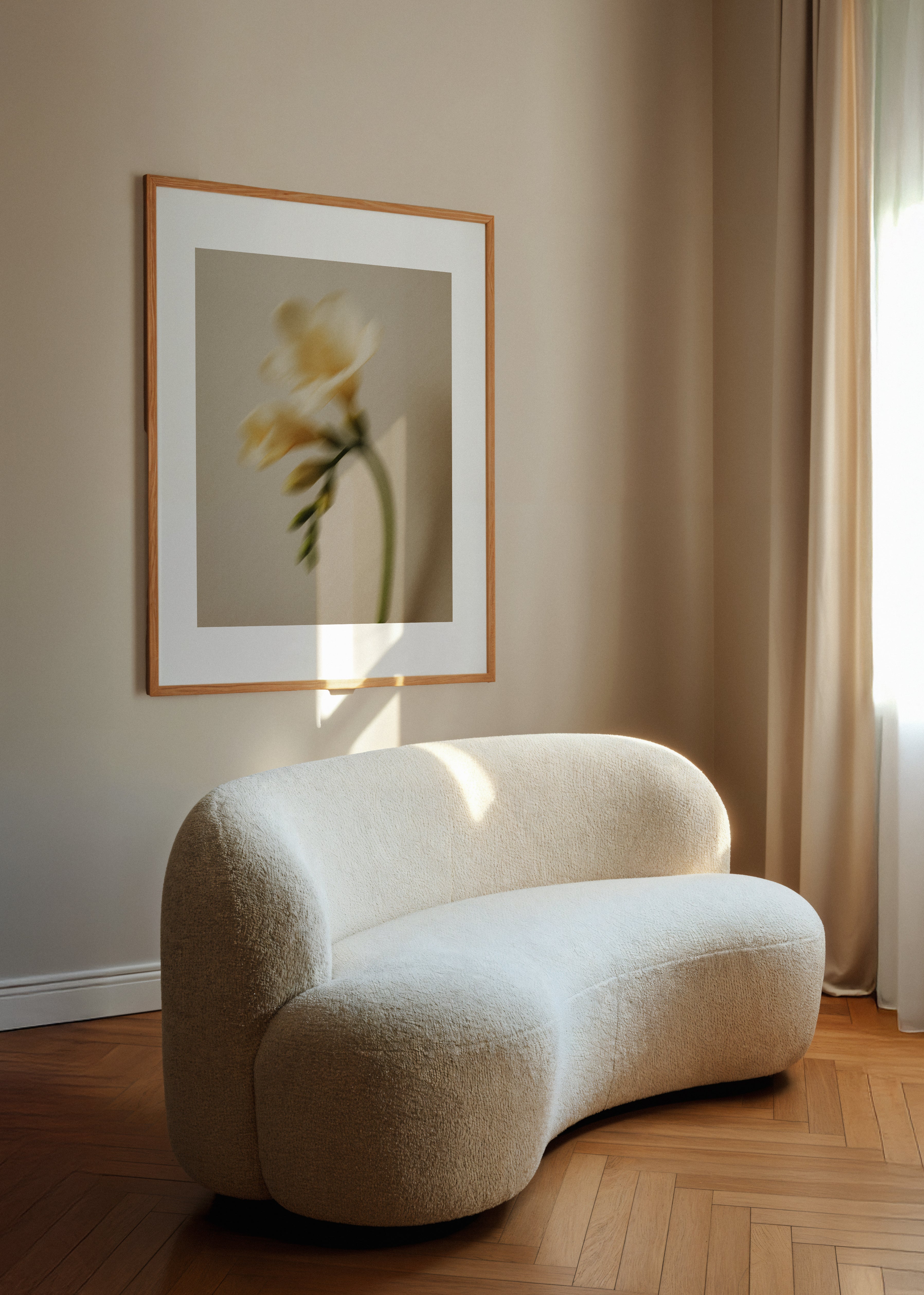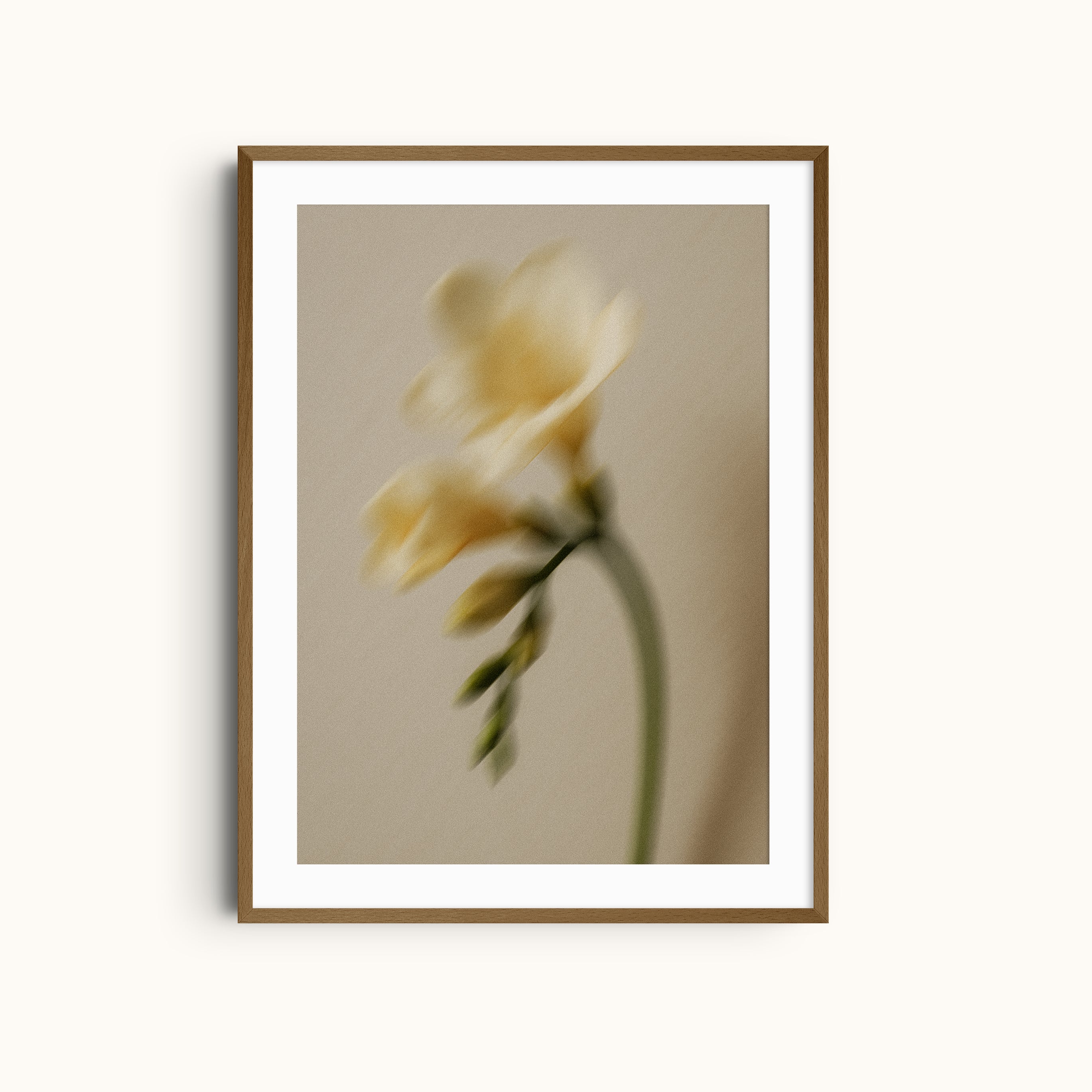Light Echo is a minimalist floral wall art print featuring a softly blurred freesia in gentle yellow tones, set against a warm beige background. The freesia, celebrated for its delicate trumpet-shaped blooms and symbolism of friendship, trust, and renewal, brings a fresh yet calming presence to any space. Its soft focus and warm palette make it perfect for Japandi bedrooms, Scandinavian living rooms, or warm minimalism apartments. A refined choice for interiors that embrace natural textures, light-filled spaces, and timeless botanical elegance.