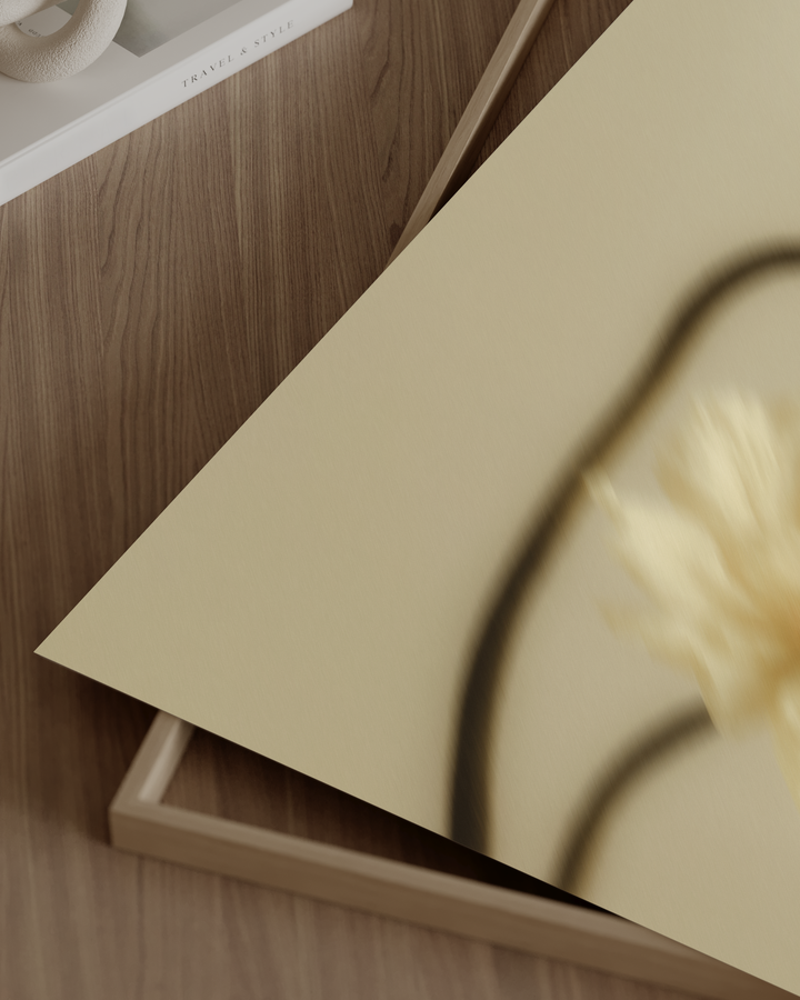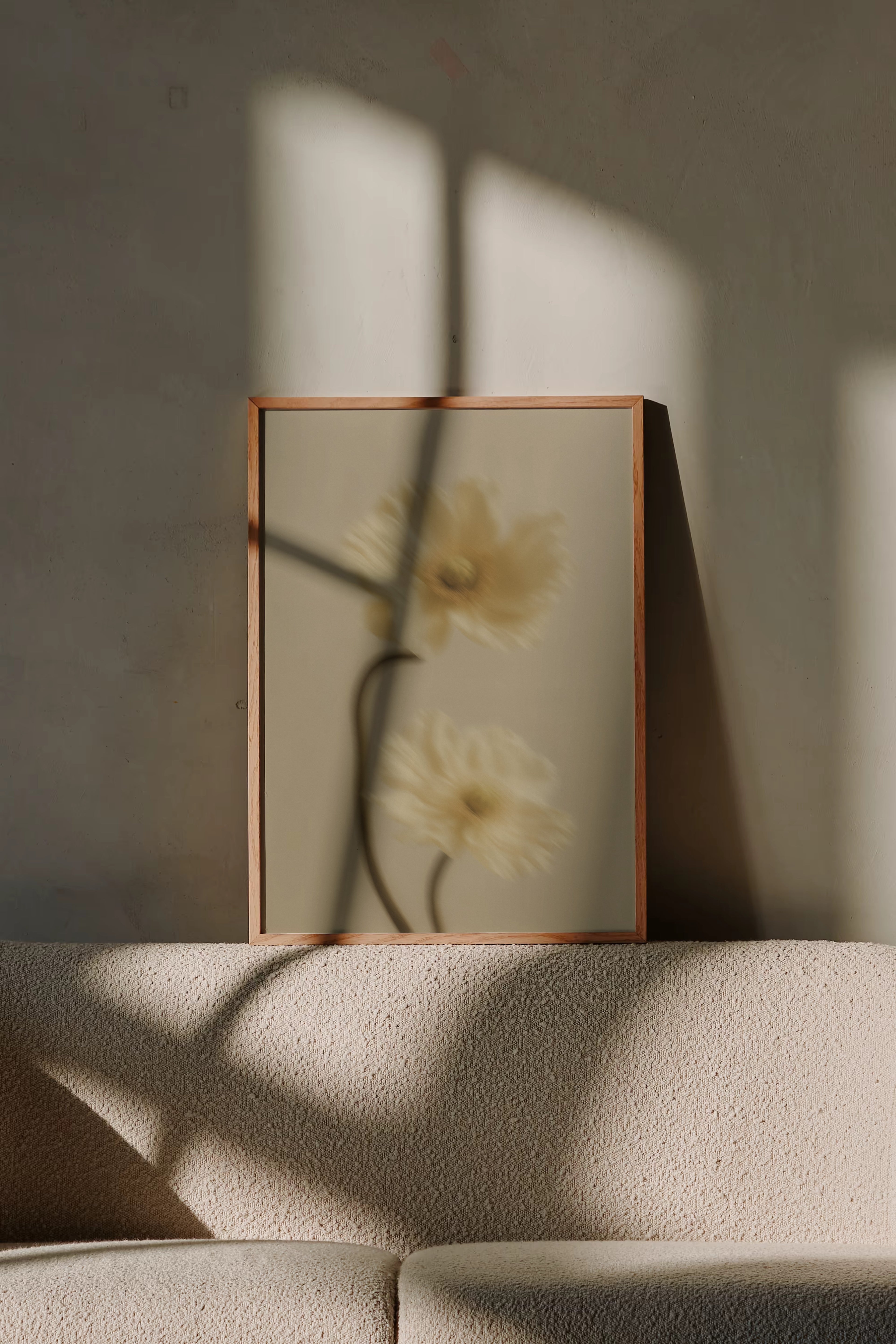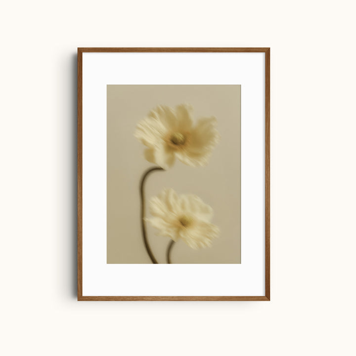 Lemon Stillness is a minimalist floral art print featuring two sunflower-like blooms in a vibrant lemon yellow, set against a greenish beige background with a soft blurred motion effect. The gentle movement within the composition evokes warmth, optimism, and the fleeting beauty of nature. Ideal for modern, Japandi, or slow-living inspired interiors, it adds a fresh burst of color while maintaining a calm, refined aesthetic. A perfect choice for creating an uplifting yet serene atmosphere in any room.