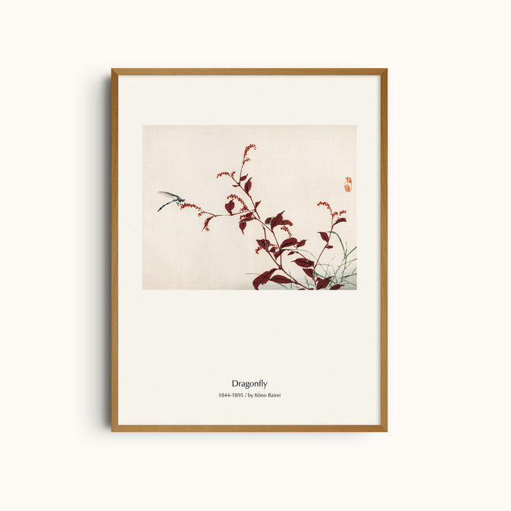 Dragonfly is a serene Japanese botanical art print by Kōno Bairei, created in the late 19th century and rooted in traditional kachō-ga (bird-and-flower) painting. The composition features a delicate dragonfly hovering near slender branches and leaves, rendered with refined brushwork and generous negative space. The balance between movement and stillness gives the artwork a calm, contemplative presence.