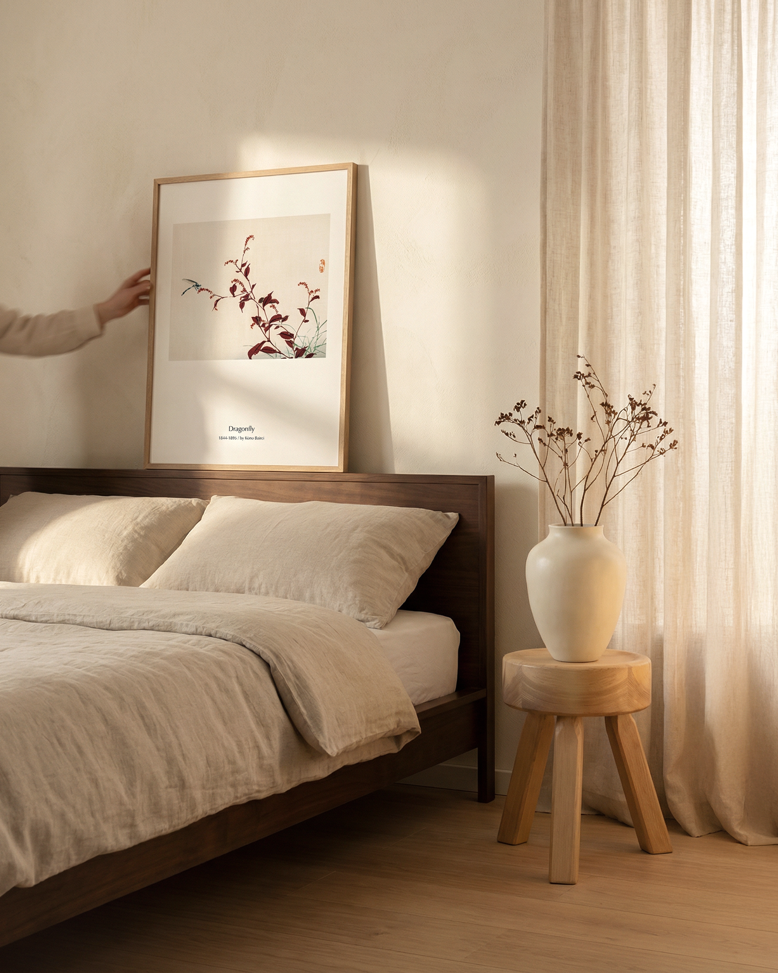 The soft neutral background and subtle red accents make this print especially suited for modern minimalist interiors, Scandinavian homes, and Japandi-inspired spaces. Its airy composition and natural elegance allow it to blend effortlessly into calm, light-filled rooms while adding cultural depth and visual softness.