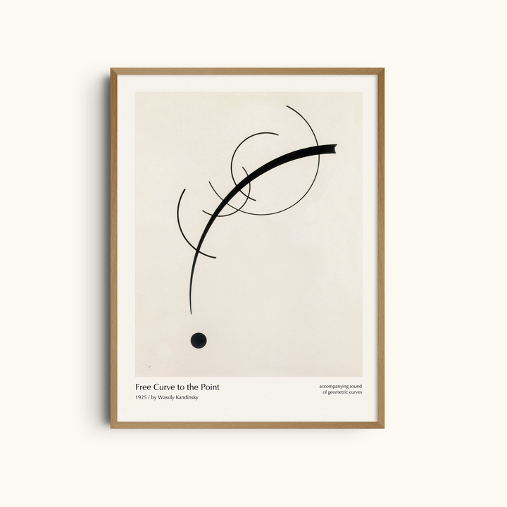 Free Curve to the Point is a refined abstract art print by Wassily Kandinsky, created in 1925 during his influential Bauhaus period. The composition features flowing black curves intersecting with precise circular forms, exploring the relationship between movement, balance, and visual rhythm. The restrained use of line and space transforms the artwork into a quiet study of harmony and tension.
