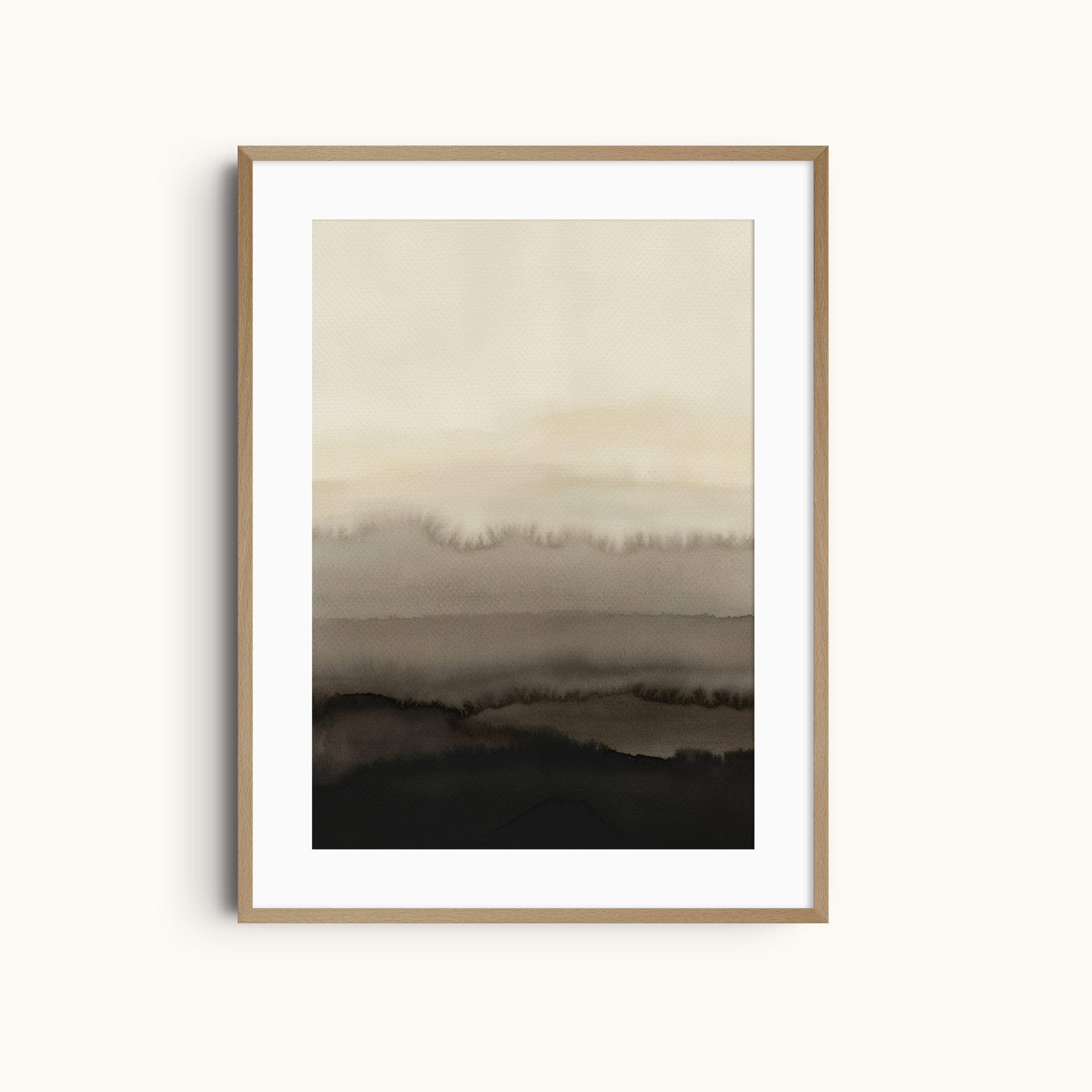 Muted Landscape art print captures the quiet beauty of nature through soft layers of beige, taupe, and deep charcoal tones. This neutral abstract watercolor print evokes the feeling of misty horizons and gentle transitions between earth and sky, bringing calm and depth to any space.
