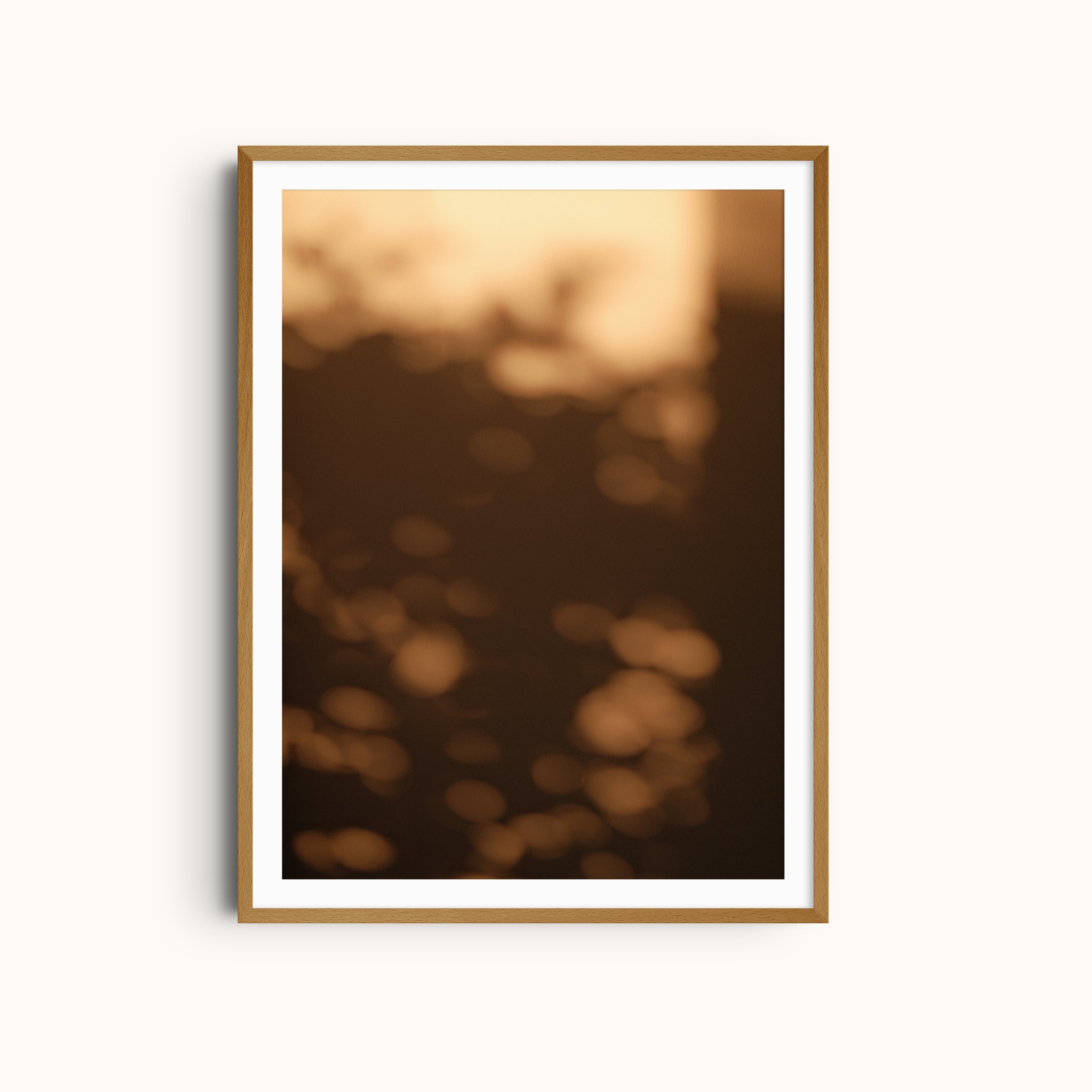 Melted Sunset minimalist art print captures the soft, blurred reflections of evening light — a gentle play of warm amber tones and delicate shadows that evoke calm and nostalgia. The image feels like sunlight melting through trees at dusk, creating a soothing, timeless atmosphere that brings warmth and depth to any space.