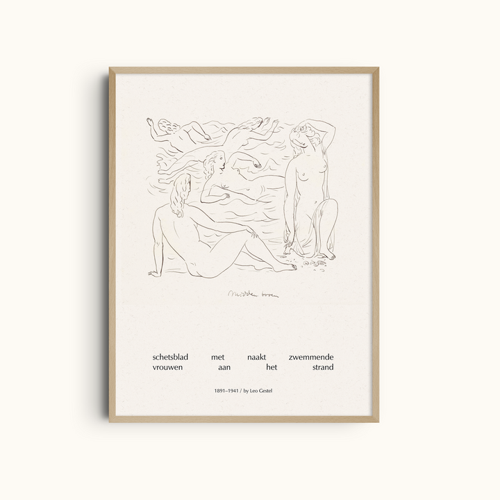 Sketchblad met naakt zwemmende vrouwen aan het strand by Leo Gestel is a refined modernist line drawing created by the Dutch artist between 1891 and 1941. This delicate sketch depicts nude female figures swimming and resting by the shoreline, rendered with fluid, expressive lines that emphasize movement, rhythm, and the natural connection between the human body and water.
