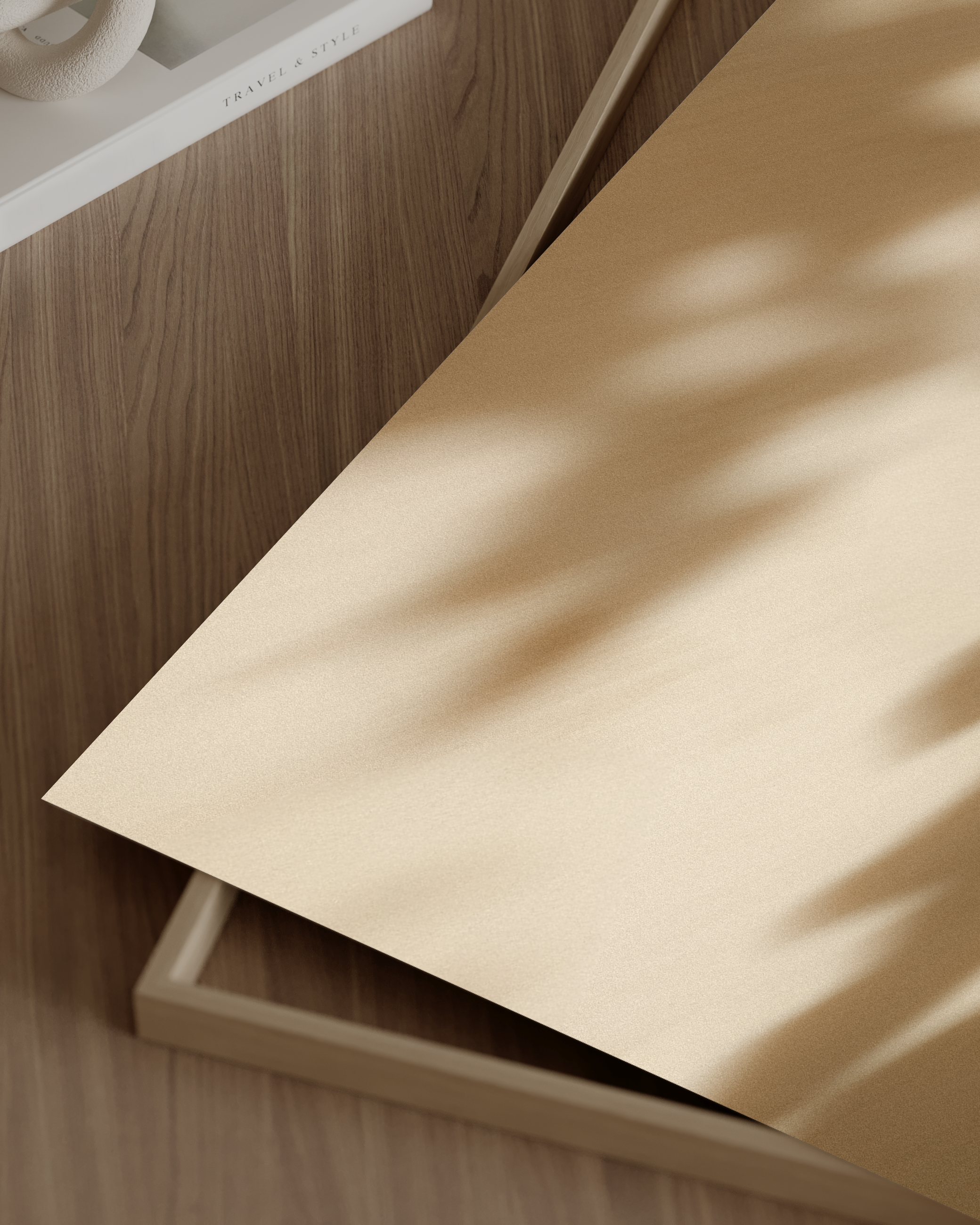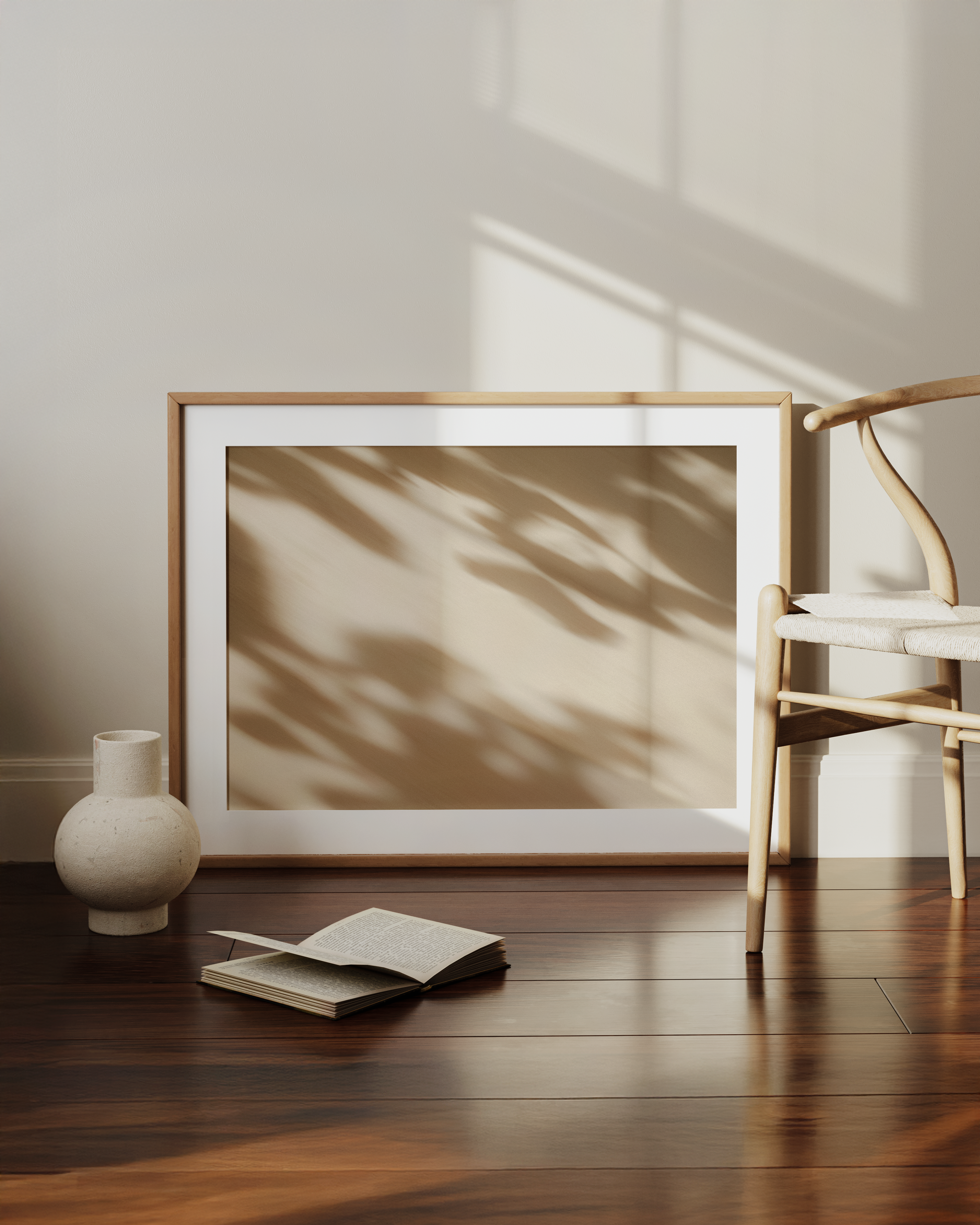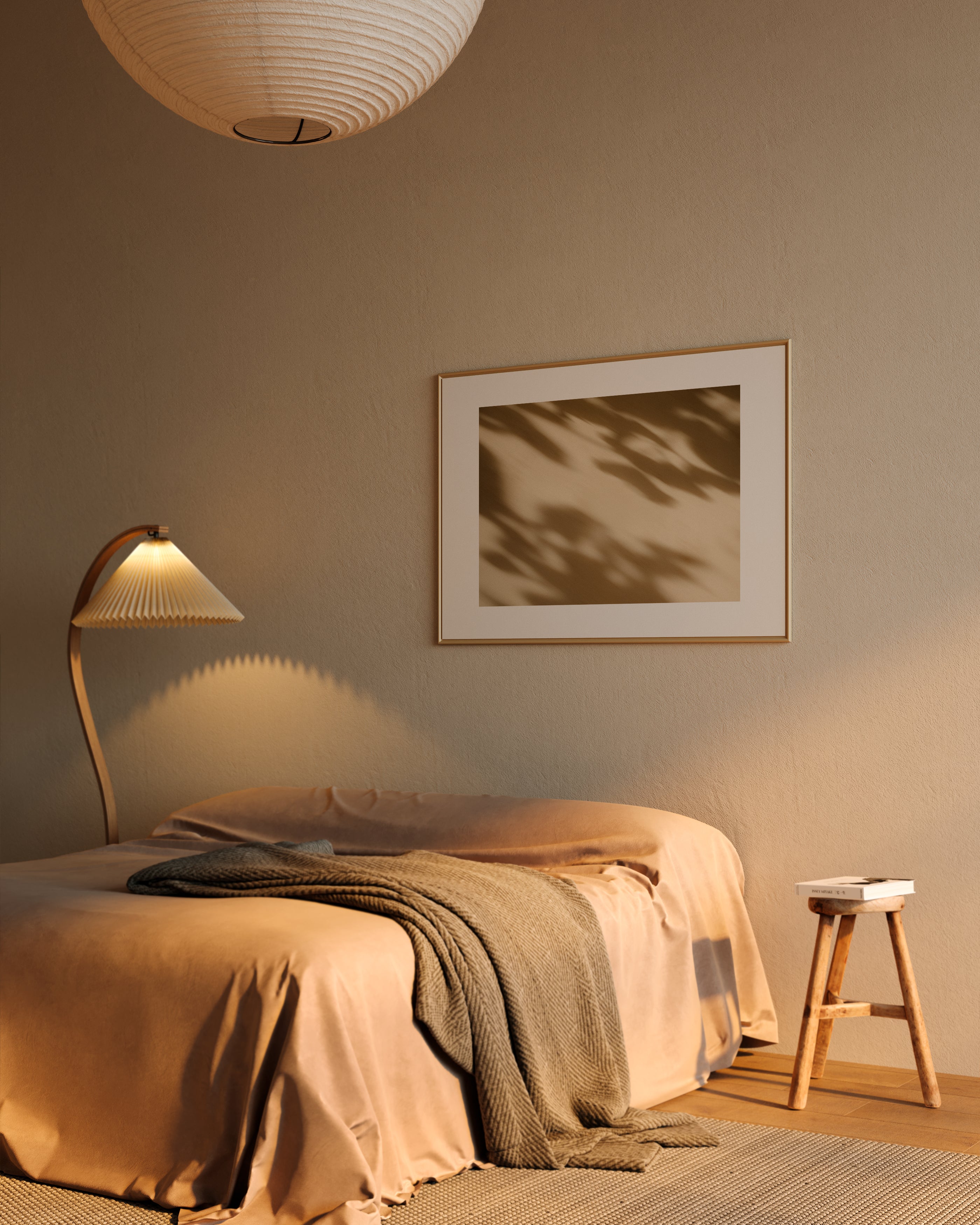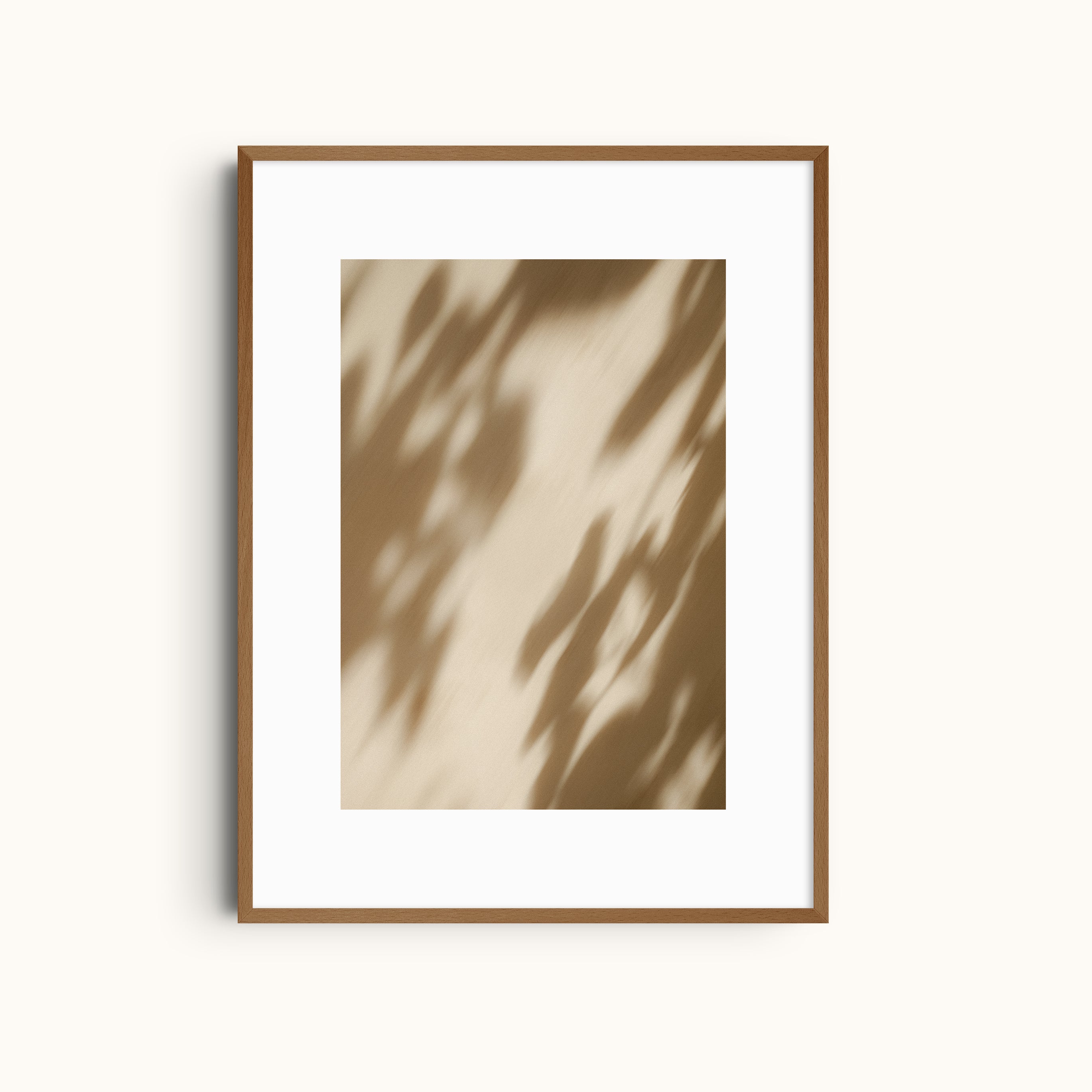 Amber Haze is a minimalist wall art print featuring fluid, abstract botanical shadows in rich amber and soft beige tones. The gentle movement of light and shade evokes the warmth of a late afternoon sun, making it an inviting addition to Japandi living rooms, Scandinavian style apartments, and warm minimalism interiors. Its organic patterns add depth and texture while maintaining a calm, understated aesthetic. A versatile piece that blends seamlessly with natural wood, woven textiles, and earthy color palettes.