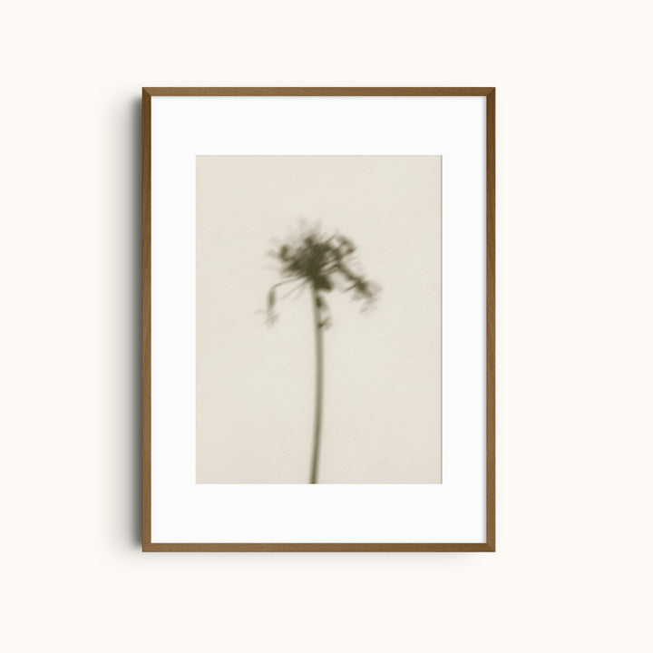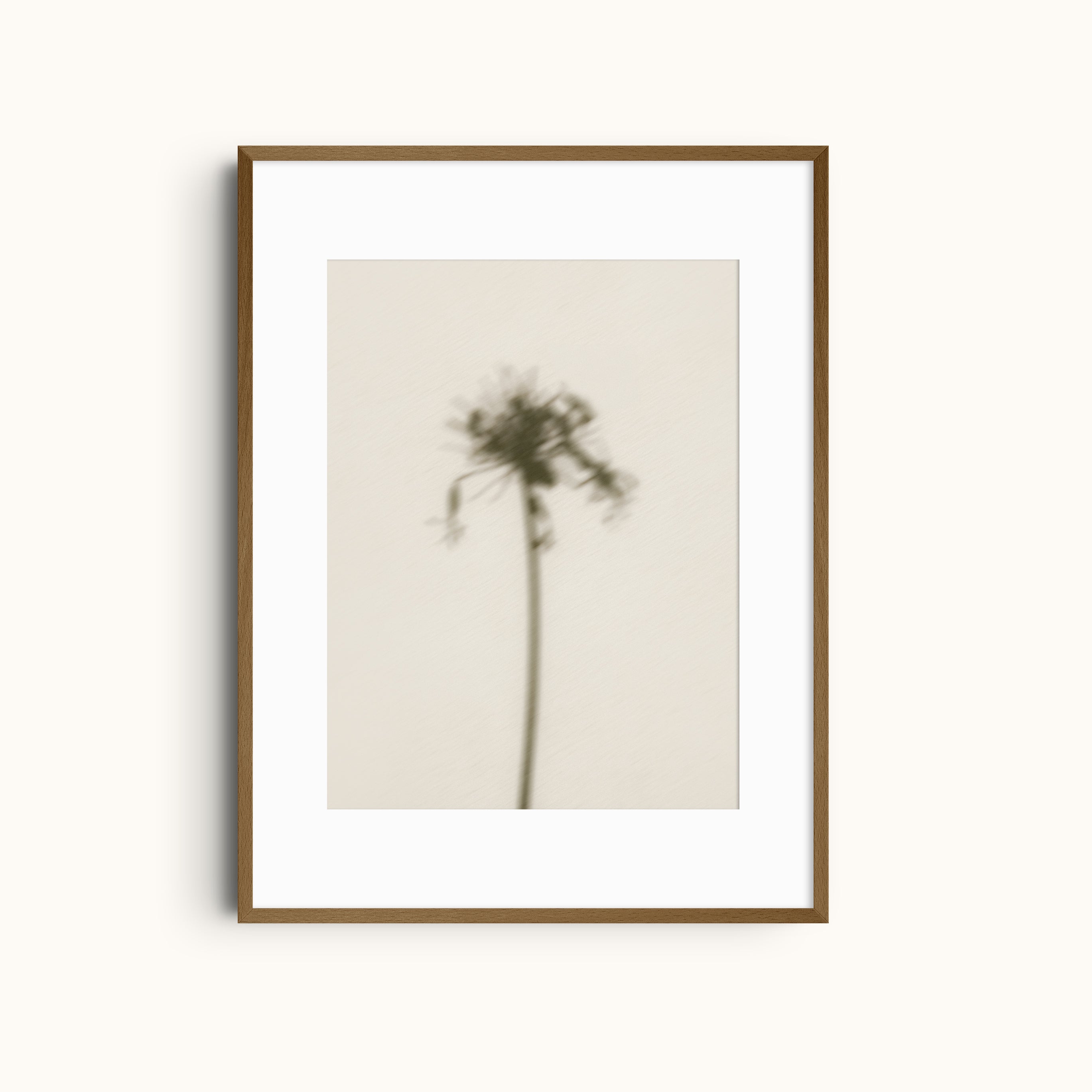 Still Hour is a minimalist wall art print portraying the soft, blurred silhouette of a single withered flower stem against a light cream background. The delicate, almost ghostlike form captures the quiet beauty of impermanence, making it a thoughtful addition to Japandi living rooms, Scandinavian style apartments, or warm minimalism interiors. Its understated composition pairs effortlessly with natural wood, linen, and muted tones, bringing a sense of calm and reflection. A poetic piece that celebrates nature’s gentle passage of time.