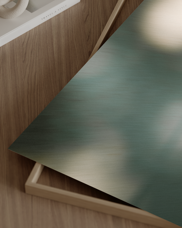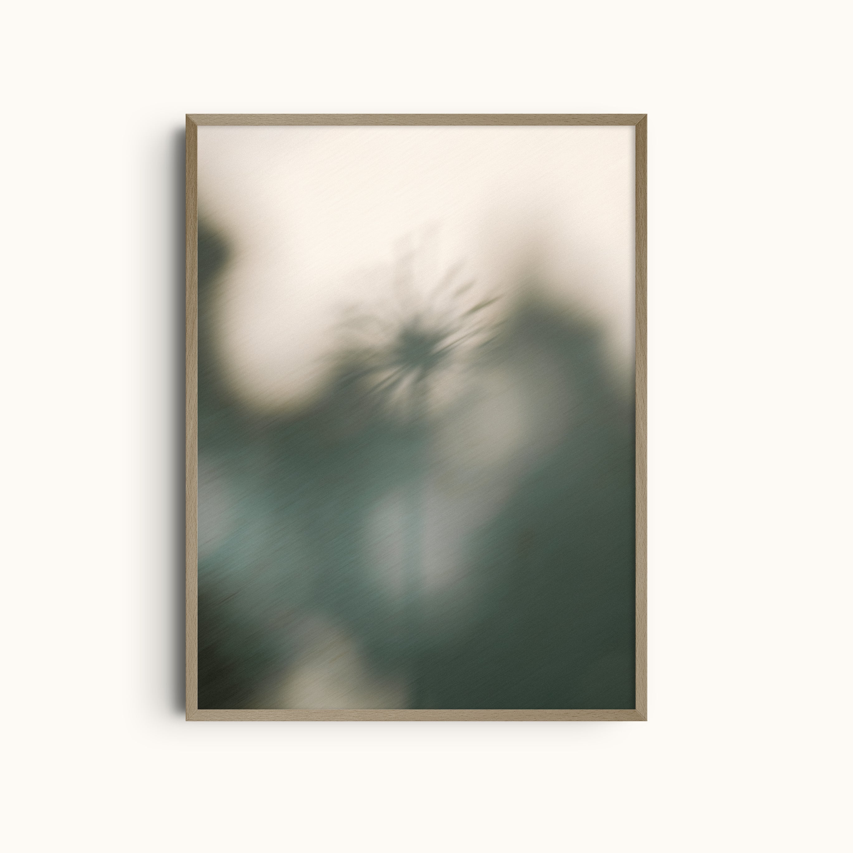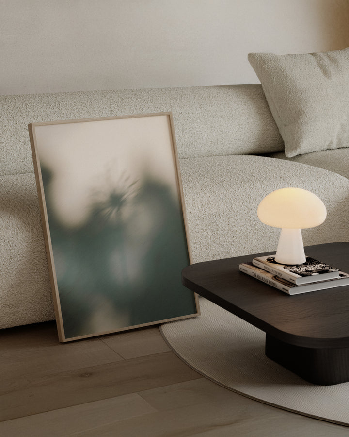 Cold Breeze is a minimalist wall art print featuring the soft, blurred silhouette of a dandelion surrounded by gentle botanical shapes in cool green and muted cream tones. The dandelion, often symbolizing hope, transformation, and fleeting beauty, appears here as if caught in a quiet morning mist, evoking a sense of stillness before change. Its tranquil palette pairs effortlessly with natural wood, woven textures, and stone details, making it a grounding yet uplifting addition to any space.