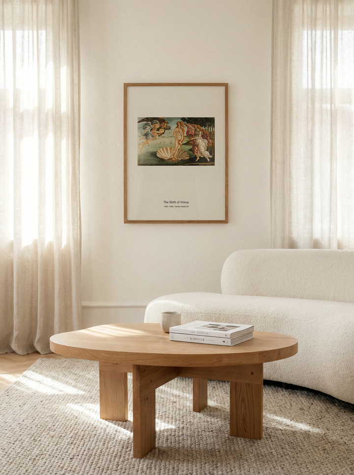 This art print features The Birth of Venus (1485–1486) by Sandro Botticelli, one of the most significant painters of the Italian Renaissance.